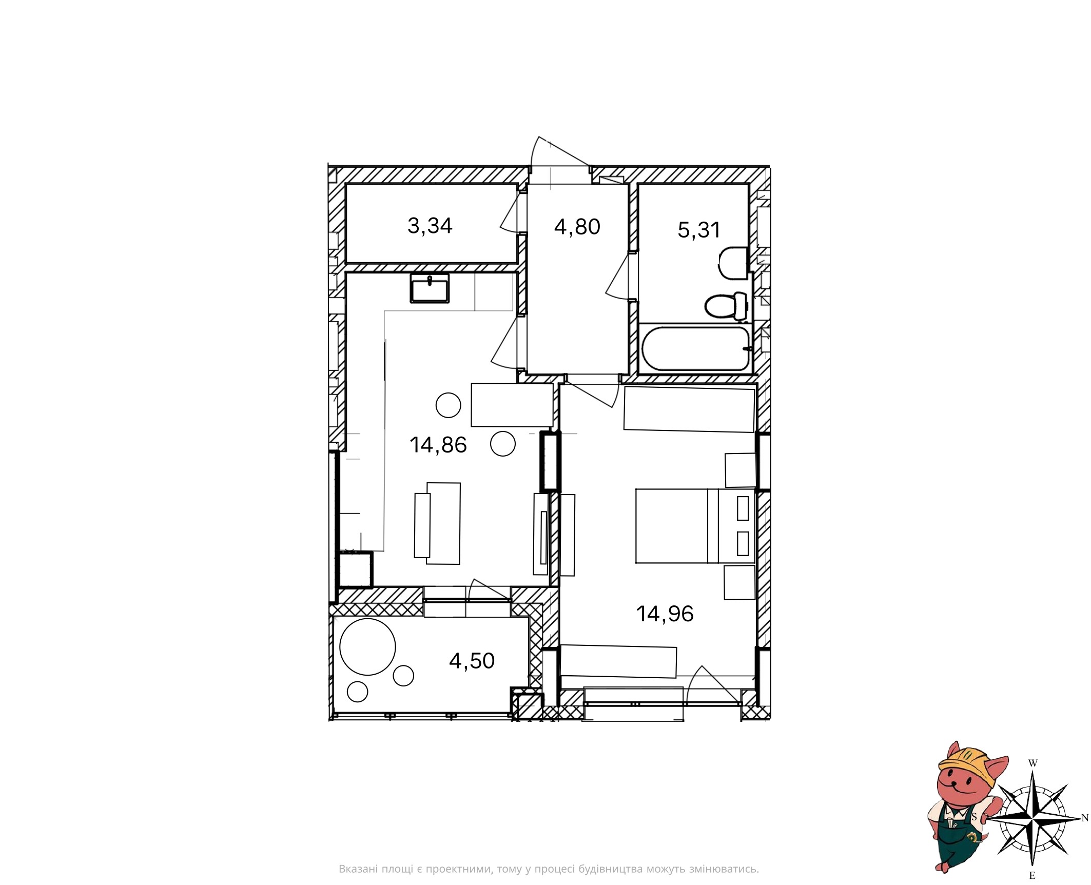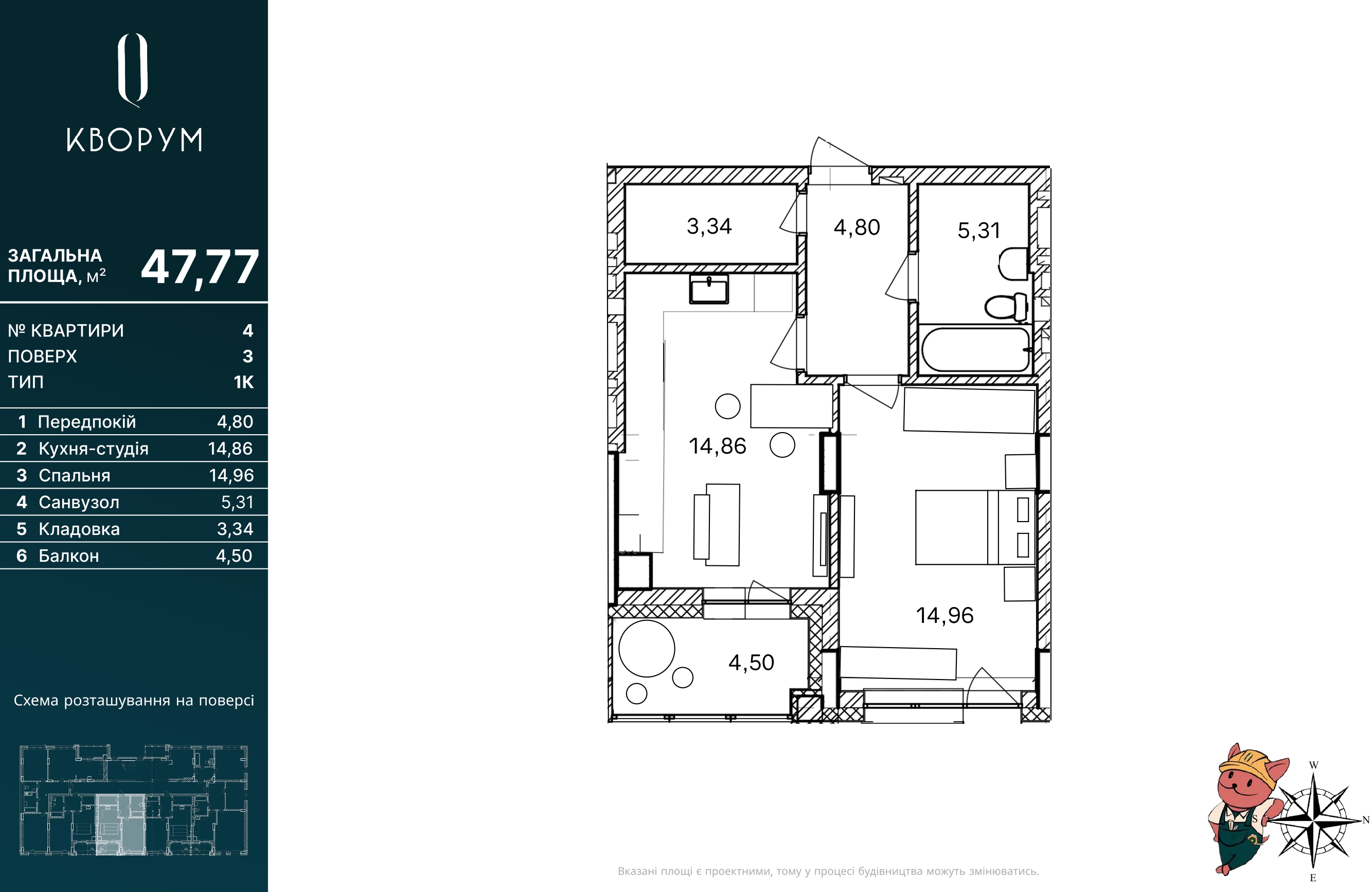 Функціональна кухня-студія (14,86 м²) з виходом на просторий балкон (4,50 м²) стане центром вашого дому. Окрема спальня (14,96 м²) правильної геометричної форми забезпечує комфортний відпочинок. Продумане планування включає також окрему кладовку (3,34 м²) для зберігання речей, місткий санвузол (5,31 м²) та зручний передпокій (4,80 м²).
