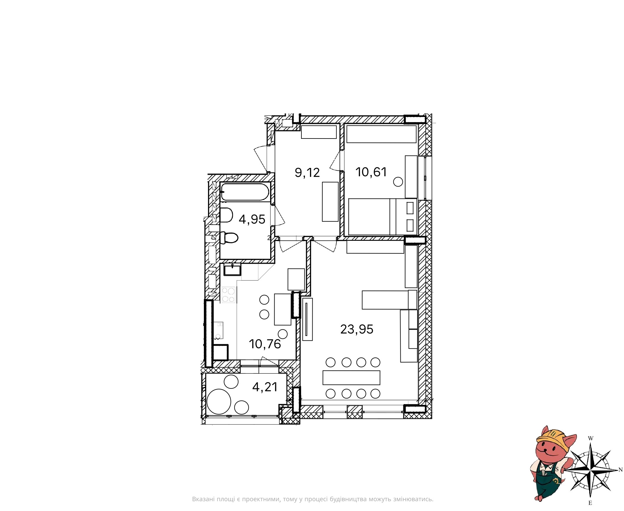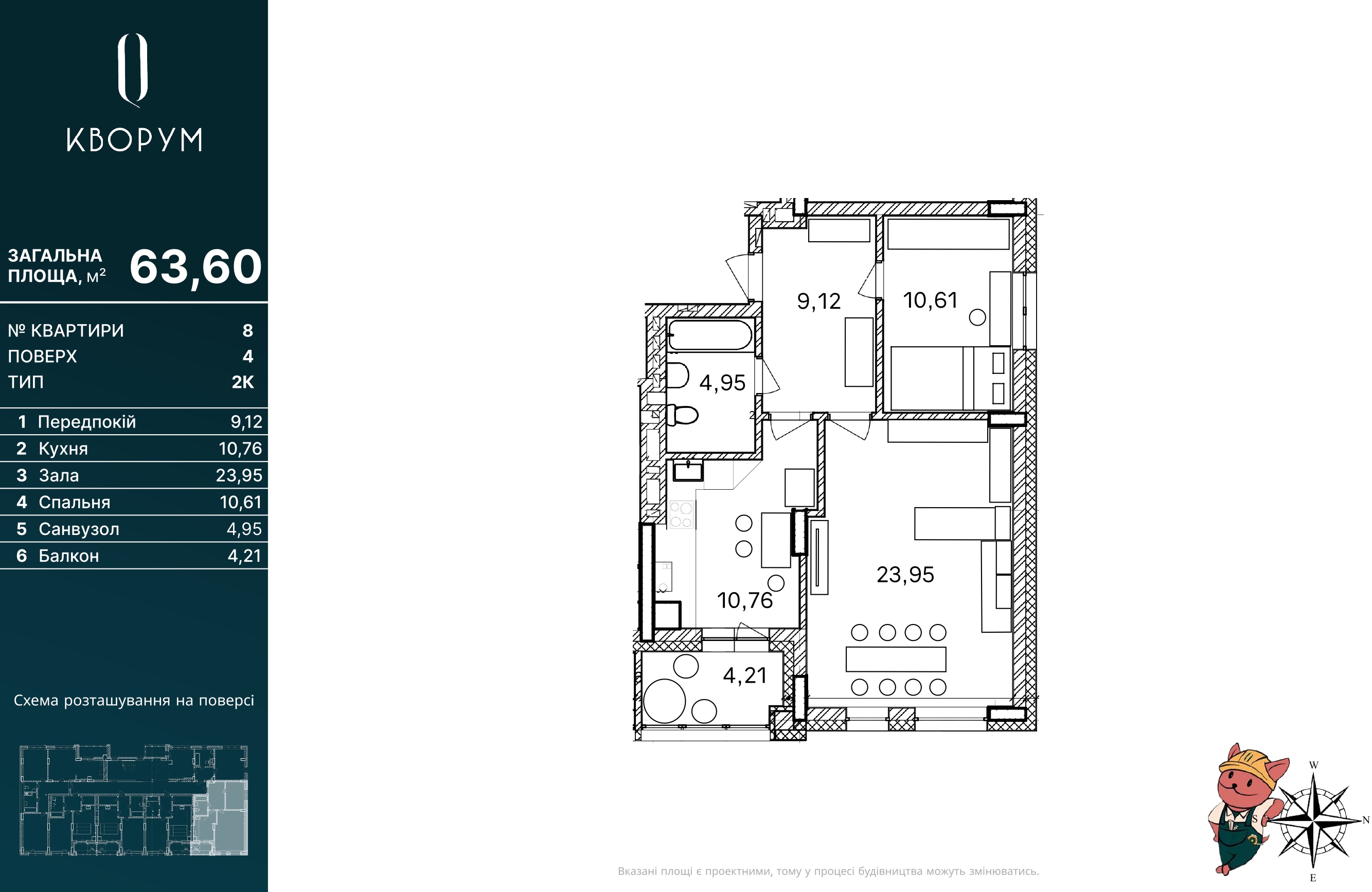 2-кімнатна квартира 63,60 м² на 4 поверсі в клубному будинку з раціональним плануванням. Простора вітальня (зала) площею 23,95 м² є центром оселі та має чудову природну інсоляцію завдяки великим вікнам. Кухня (10,76 м²) з виходом на затишний балкон (4,21 м²) дозволяє грамотно організувати зону приготування та відпочинку. Окрема спальня (10,61 м²) забезпечує приватність, а місткий передпокій (9,12 м²) та великий санвузол (4,95 м²) додають комфорту щоденному життю.