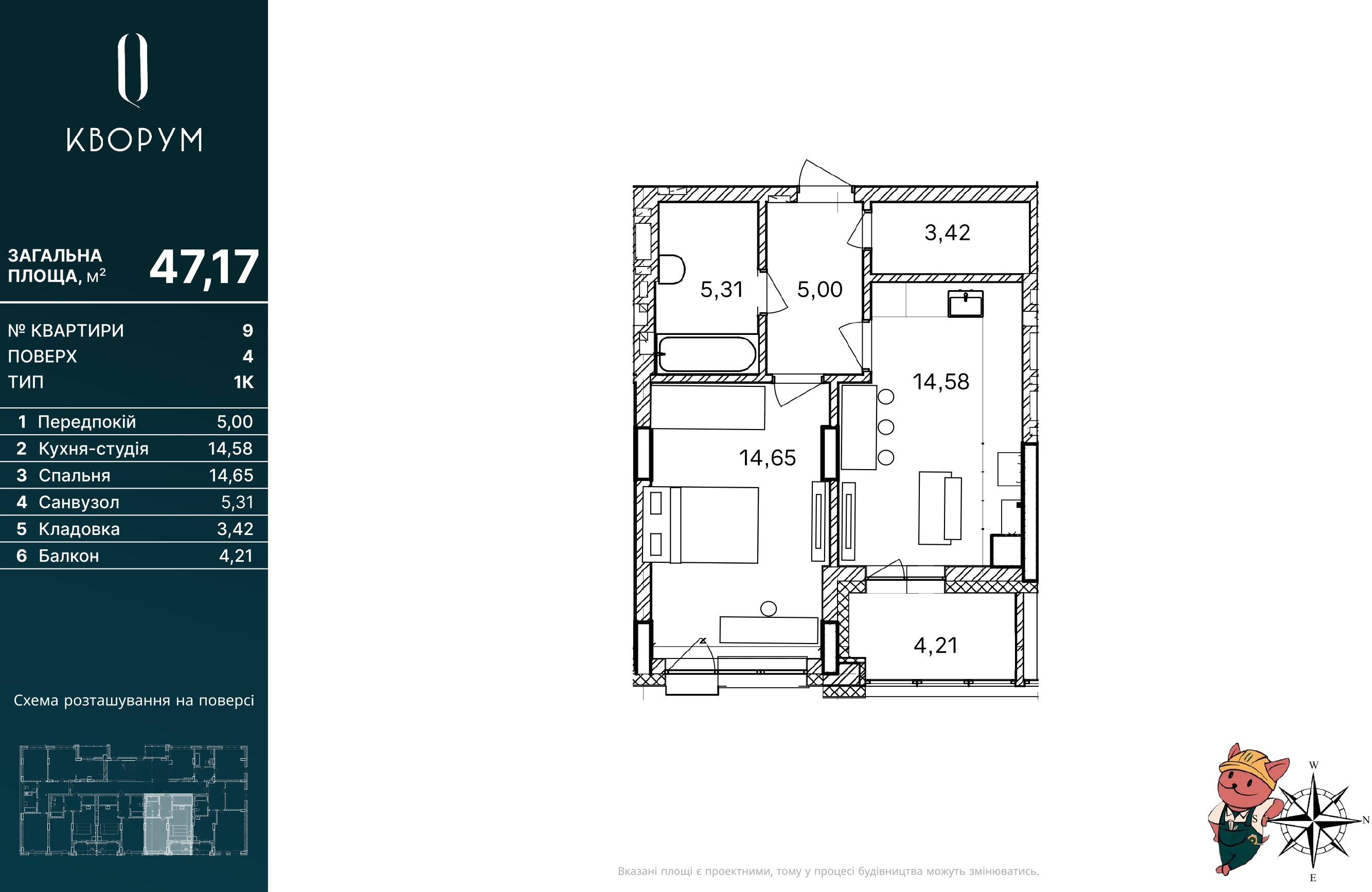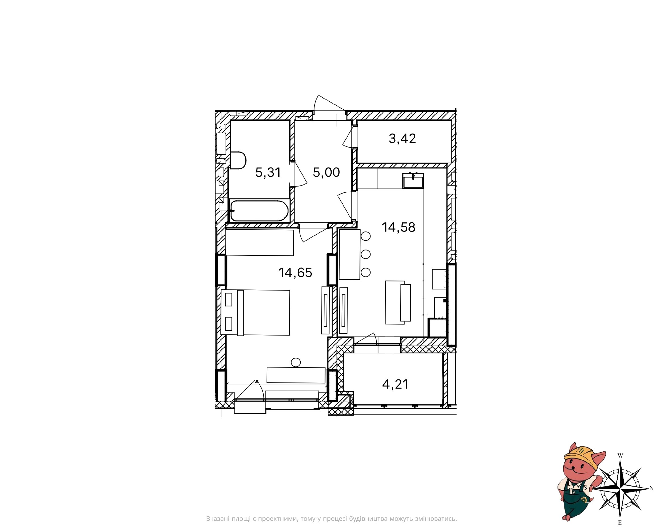 Світла кухня-студія (14,58 м²) з виходом на затишний балкон (4,21 м²) створює ідеальний простір для відпочинку та прийому гостей. Окрема спальня (14,65 м²) правильної форми дозволяє зручно розмістити велике ліжко та зону зберігання. Особливістю планування є наявність окремої кладовки (3,42 м²), що допомагає підтримувати порядок у домі, а також просторого санвузла (5,31 м²).